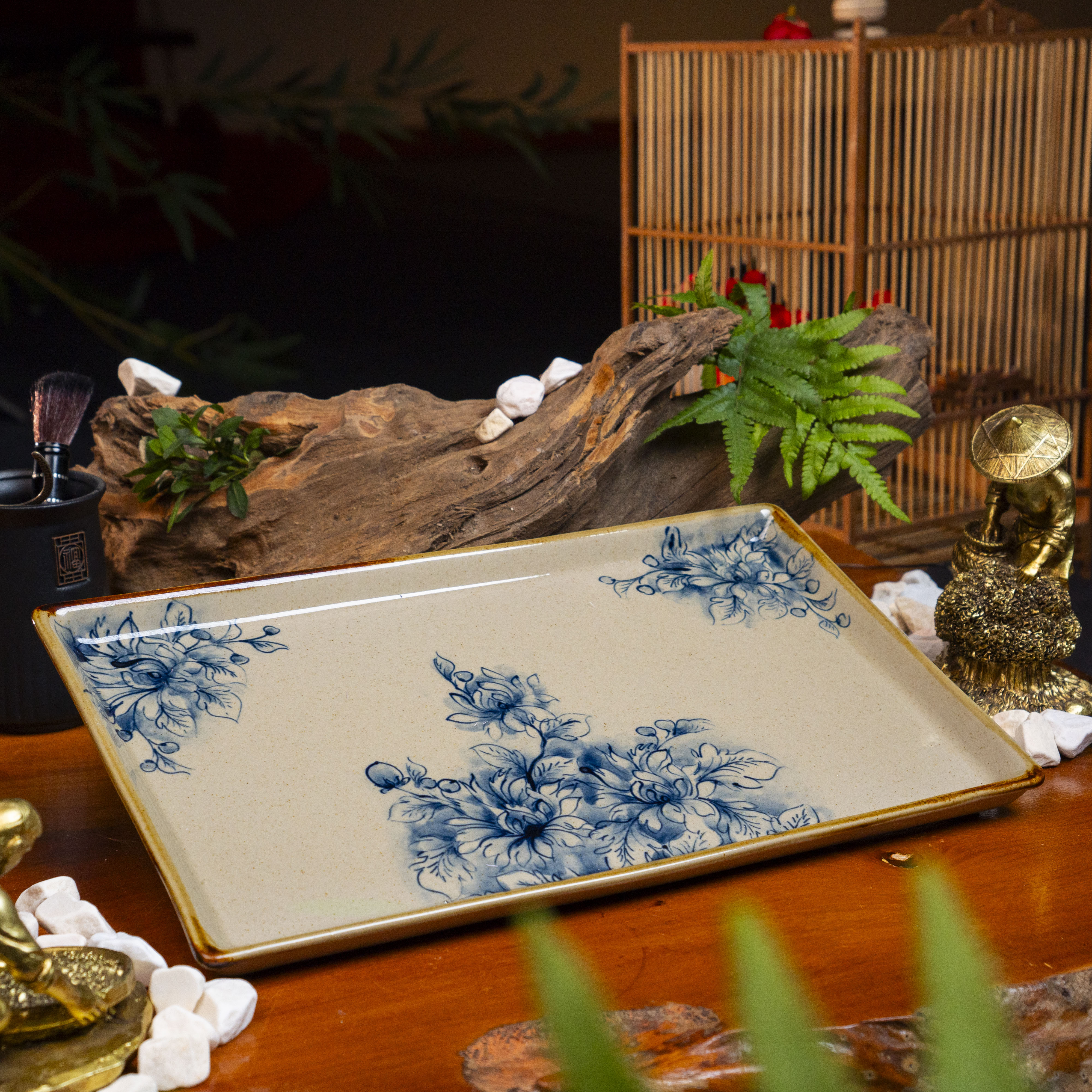 Khay đựng: Bộ ấm chén được đặt trên một khay sứ hình chữ nhật, cũng được trang trí họa tiết hoa cúc, giúp giữ vệ sinh và tăng tính thẩm mỹ khi sử dụng. Khay có viền vàng nâu, tạo sự đồng bộ với ấm và chén. - Ứng dụng và ý nghĩa: Bộ ấm chén Cúc Cổ Trường Thọ không chỉ là dụng cụ để pha và thưởng trà mà còn mang ý nghĩa phong thủy sâu sắc. Hoa cúc tượng trưng cho sự trường thọ, sức khỏe và may mắn, thường được dùng để cầu chúc cho gia đình hạnh phúc, an khang. Bộ sản phẩm rất phù hợp để sử dụng trong các buổi trà đạo, tiếp khách quý, hoặc làm quà tặng cao cấp, đặc biệt trong các dịp lễ Tết, mừng thọ, thể hiện sự trân trọng và lời chúc tốt đẹp.